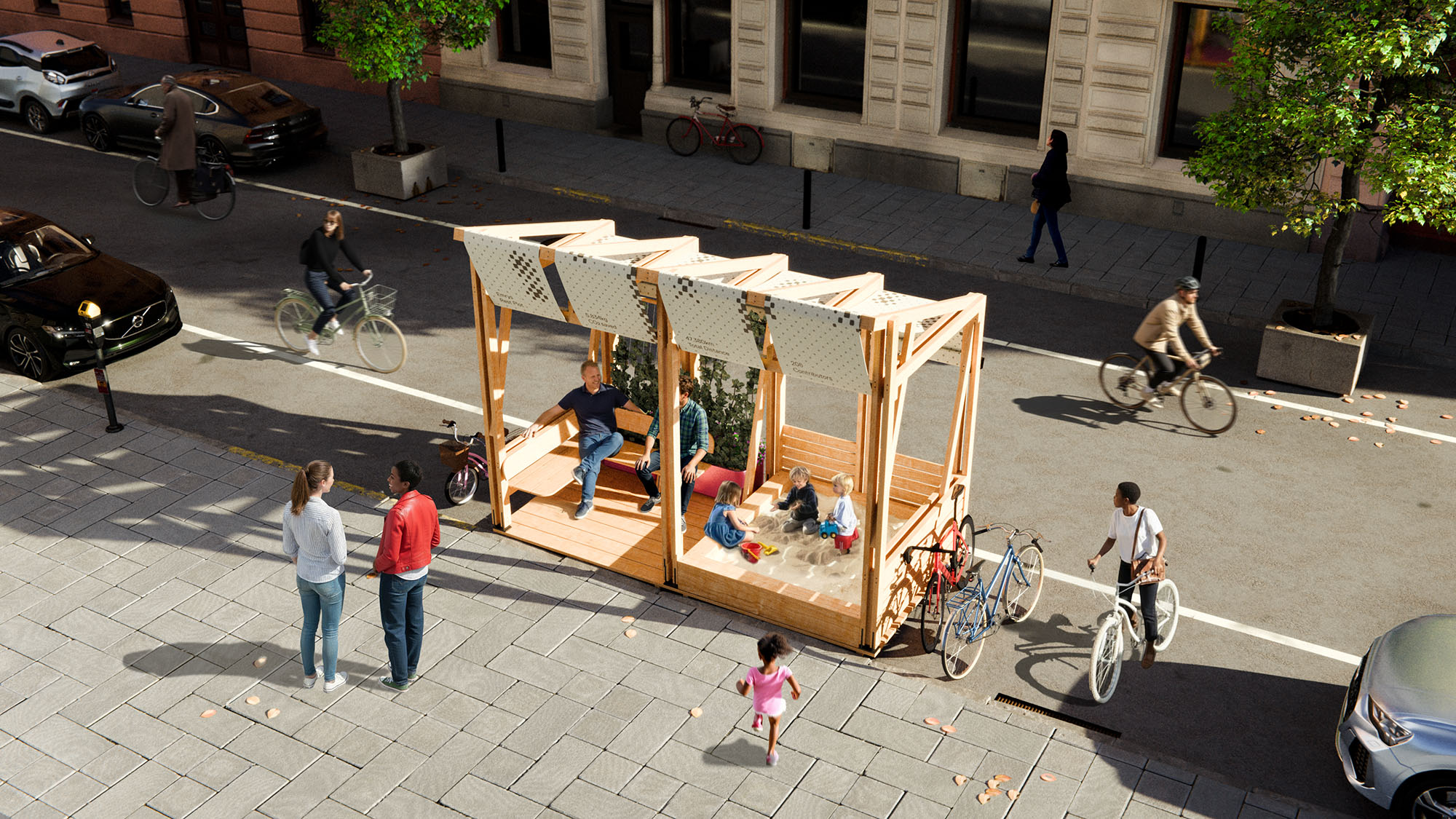 Once the community goal is reached, the neighborhood earns so-called plots. These transform parking spaces into vibrant places of togetherness.